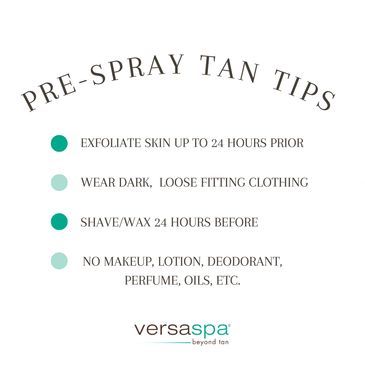 Exfoliate and shave the day before or the day of the spray tanning session (day before is preferred). The day of the spray tanning session, refrain from using moisturizers, perfumes, lotions, oils or deodorants that may create a barrier between the skin and the tanning solution. You may resume using these after your first shower or bath.